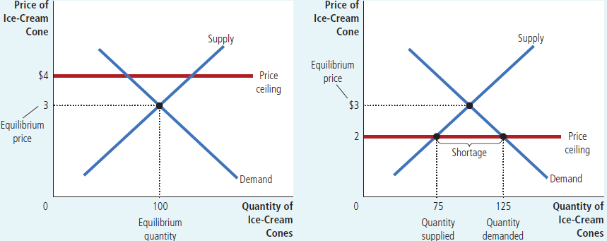 在实际中,市场并不总是处于完美竞争状态,这时候就需要政府出面进行干预。政府对市场价格的直接控制有两种手段:设定价格上限(price celing)与价格下限(price floor)。