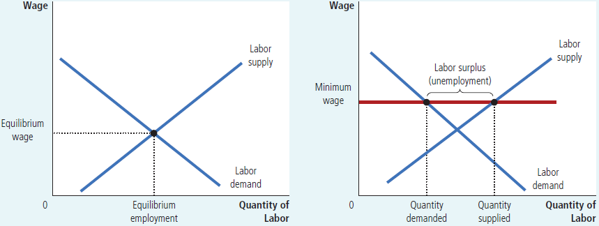 类似的,如果政府设置了价格下限,当价格下限高于平衡点价格时会造成过剩(surplus)。典型的例子就是劳动力市场,加入政府为了保证工人的生活水平而设置了较高的最低薪水,那么就会造成劳动力市场的过剩,其直接后果就是部分工人失业。
