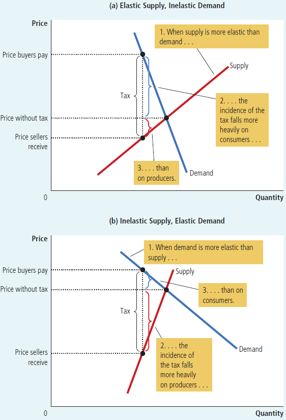 征税也是政府管控经济的手段之一。若政府对卖方征税,则会使得供给曲线上移;若对买方征税则会使得需求曲线下移。曲线在纵轴上的移动量恰好等于税值。不难发现,无论是对卖方征税还是买方征税都是等价的,但是买方跟卖方承受的税是不一样的。下图是双方具有不同弹性的DS曲线,可以看到,弹性较小的一方总是承担更重的税。