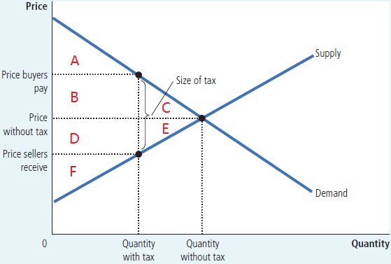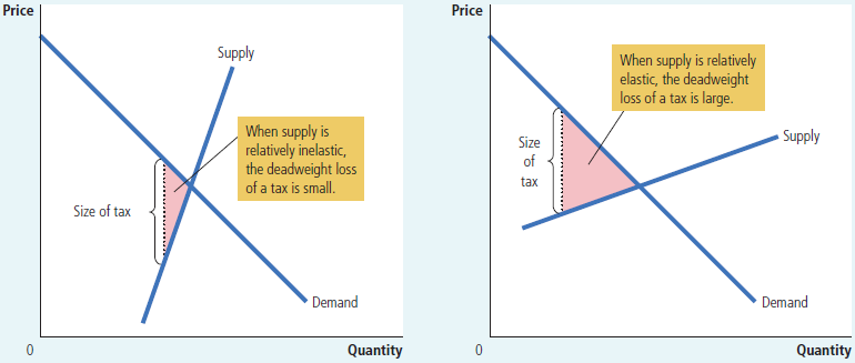 在上图中,不难得到$A$是消费者剩余,$F$是生产者剩余,$B+D$是政府的税收。相比于自由市场,$C+E$这部分的剩余消失了!这部分总剩余的损失就是净损失(deadweight loss)。在同样的税率下,净损失的量取决于供需曲线的弹性。因为净损失量等于三角形的面积,底(税率)是一定的,但是供需曲线的弹性越大则三角形的高就越大,于是净损失也越大。